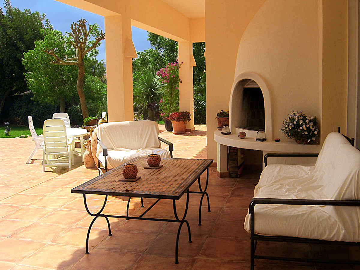 Desde el salón y la cocina puede ir a la gran naya. Aquí tiene un segundo comedor, una gran barbacoa y un área con sofás y cómodos sillones. En el techo hay altavoces de la instalación estéreo que se maneja desde el salón.